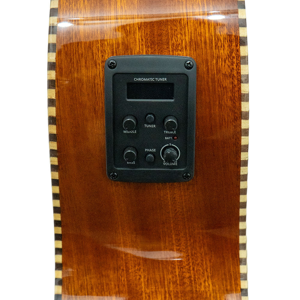 El bajo quinto BQ338CEQ de la marca La Sevillana es una herramienta de alto rendimiento que equilibra perfectamente la tradición con la tecnología moderna. Visualmente, el instrumento es una joya; la tapa de maple flameado resalta bajo el acabado brillante (gloss), mientras que los aros y fondo de sapele proporcionan esa calidez y resonancia necesarias para que el ritmo "macizo" del bajo quinto destaque en cualquier agrupación. En el aspecto técnico, la marca no ha escatimado en detalles. La cejuela de hueso natural y el puente de nogal aseguran una transferencia de vibración óptima hacia la caja, resultando en notas más definidas y con mayor sustain. Para el músico que toca en vivo, la electrónica integrada es un salvavidas: el sistema de ecualización de 3 bandas permite ajustar los graves, medios y agudos directamente desde el instrumento, y el afinador incorporado garantiza que las 10 cuerdas de acero permanezcan en su punto exacto. Con una construcción robusta que incluye maquinaria Derong y un alma ajustable, el BQ338CEQ está listo para resistir las exigencias del estudio, el ensayo o las giras más intensas.