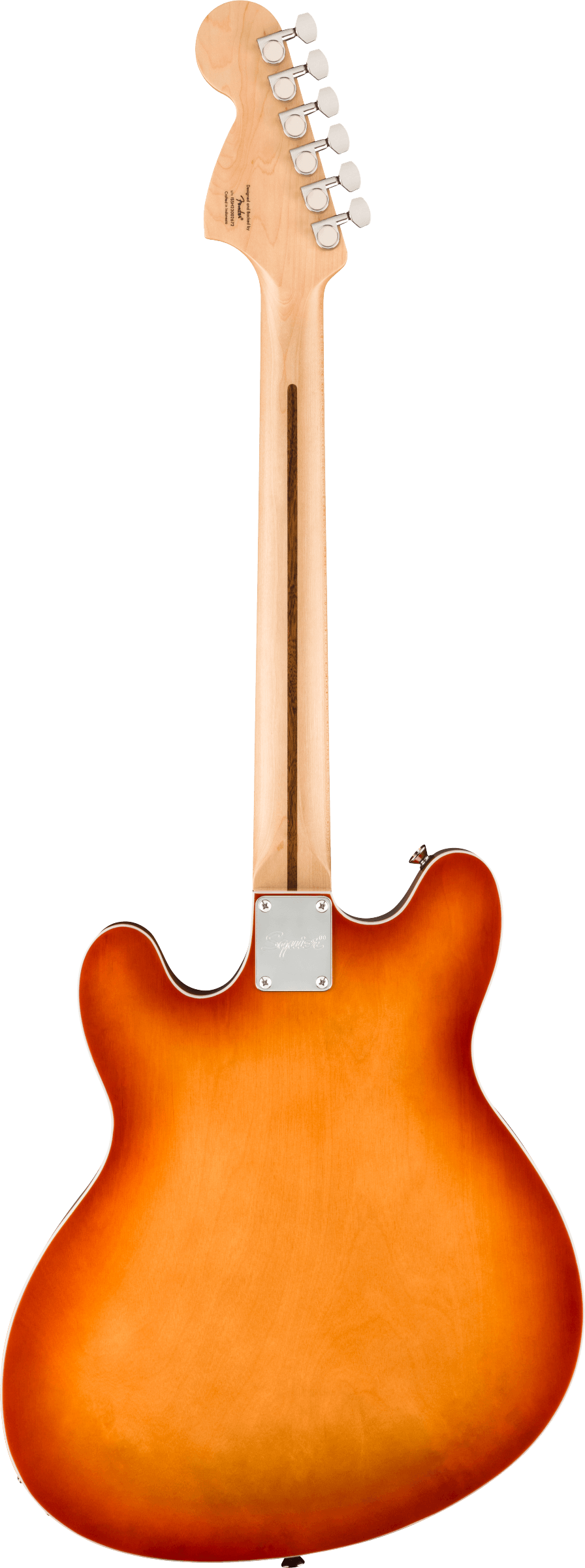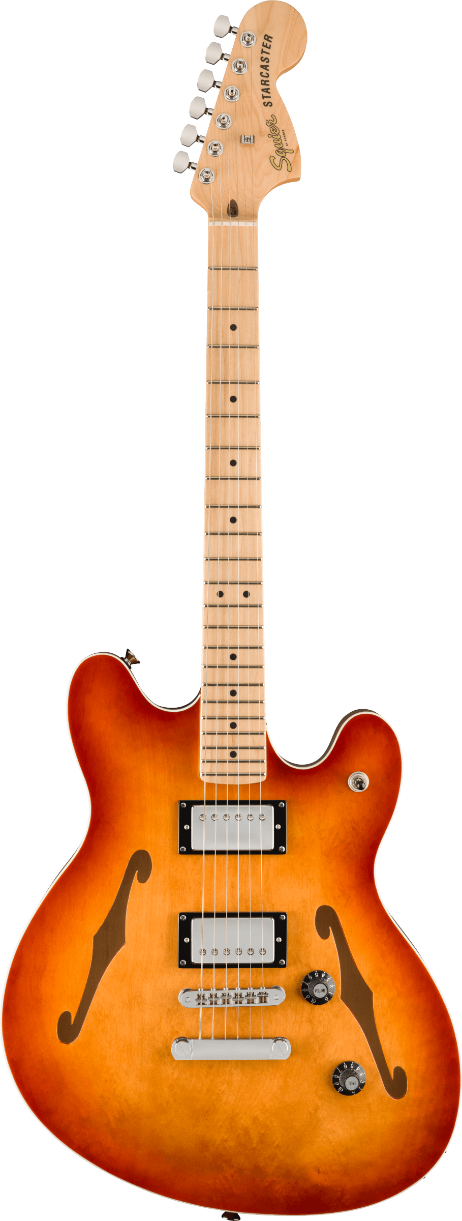 La Affinity Series® Starcaster Deluxe incorpora varias mejoras orientadas al intérprete, como un cuerpo semi-hueco ligero, un mástil delgado y cómodo con perfil en “C” y la clásica pala tipo Stratocaster®, un puente ajustable con cordal fijo que garantiza una gran estabilidad de afinación y clavijas selladas de fundición a presión con ejes partidos para una afinación precisa y un cambio de cuerdas sencillo.