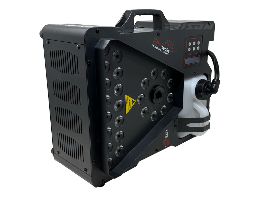 Máquina de humo con iluminación LED integrada, diseñada para generar efectos visuales en eventos o espectáculos. Cuenta con una potencia de 1500 W y una salida de humo de 850 m³ por minuto. Permite disparo de humo en tres posiciones: vertical, horizontal y de cabeza.