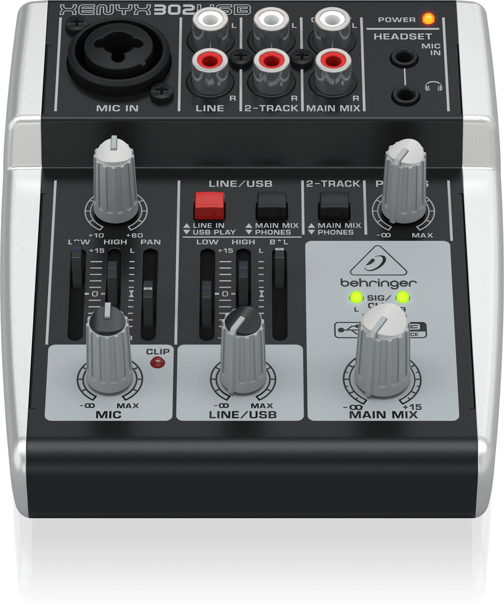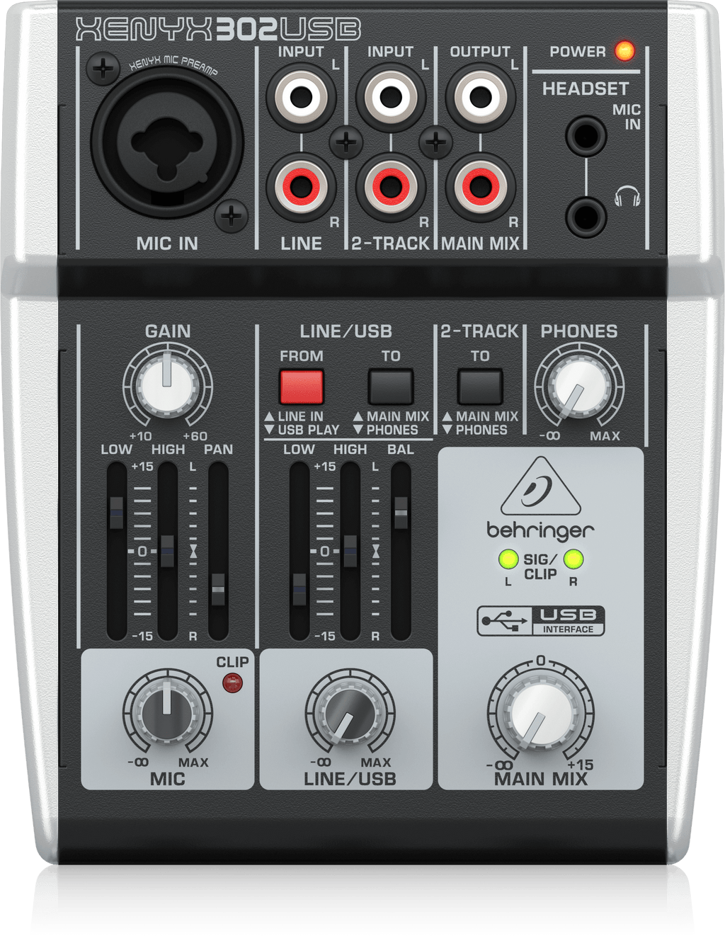 La Behringer XENYX 302USB es una mezcladora analógica compacta con interfaz de audio USB integrada. Está diseñada para tareas básicas de grabación, videollamadas, streaming o podcasting. Puede alimentarse directamente desde un puerto USB o mediante un adaptador externo de 5V.