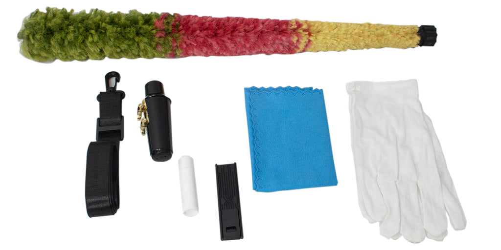 Un estuche ligero, una correa para el cuello, un paño de limpieza, una varilla de limpieza, un par de guantes y una caña.